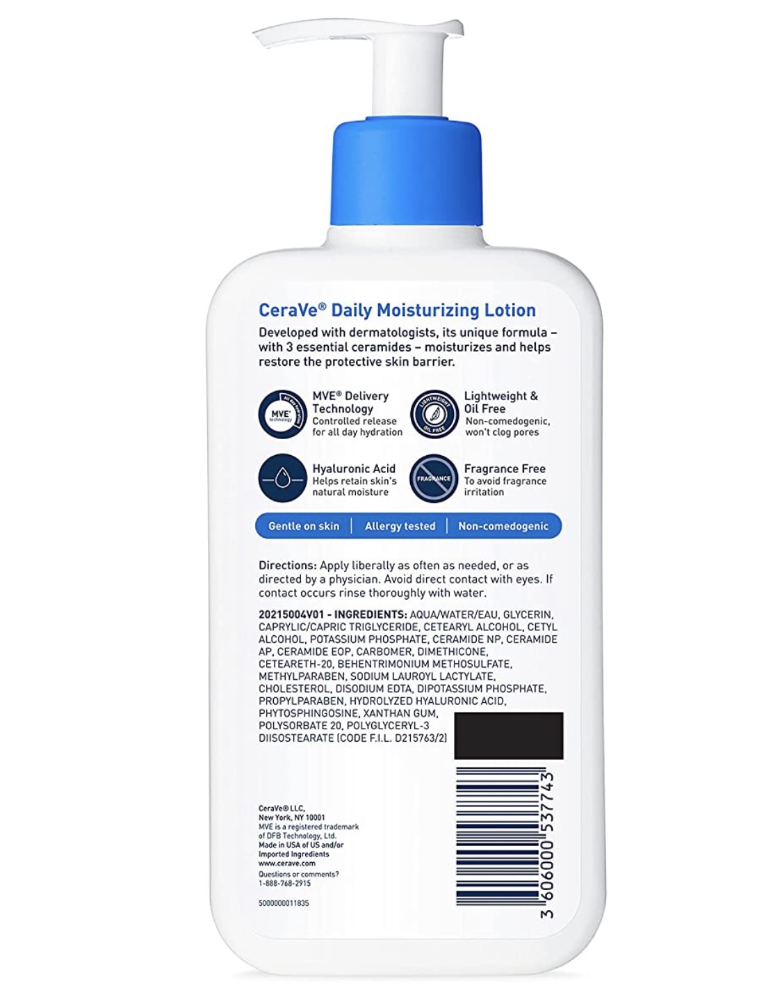 CeraVe Daily Moisturizing Lotion es un humectante liviano y sin aceite que ayuda a hidratar la piel y restaurar su barrera natural. Formulado con 3 ceramidas esenciales que trabajan juntas para retener la humedad de la piel y ayudar a restaurar la barrera protectora de la piel. La tecnología MVE encapsula ceramidas para asegurar una entrega eficiente dentro de la barrera de la piel y una liberación lenta con el tiempo. Apoyando su barrera protectora de la piel, mucho después de que haya terminado de aplicar. Nuestro humectante diario deja la piel con una sensación cómoda y es suave con la piel, ya que brinda hidratación las 24 horas.